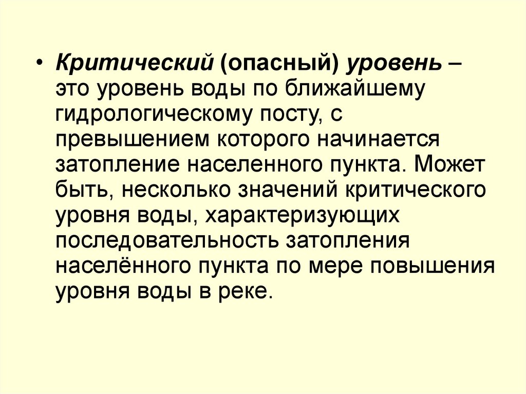 • Критический (опасный) уровень –это уровень воды по ближайшему