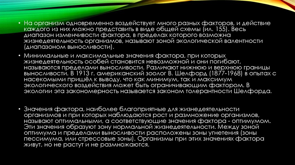пессимума, или стрессовые зоны). Организмы при этих значениях фактора