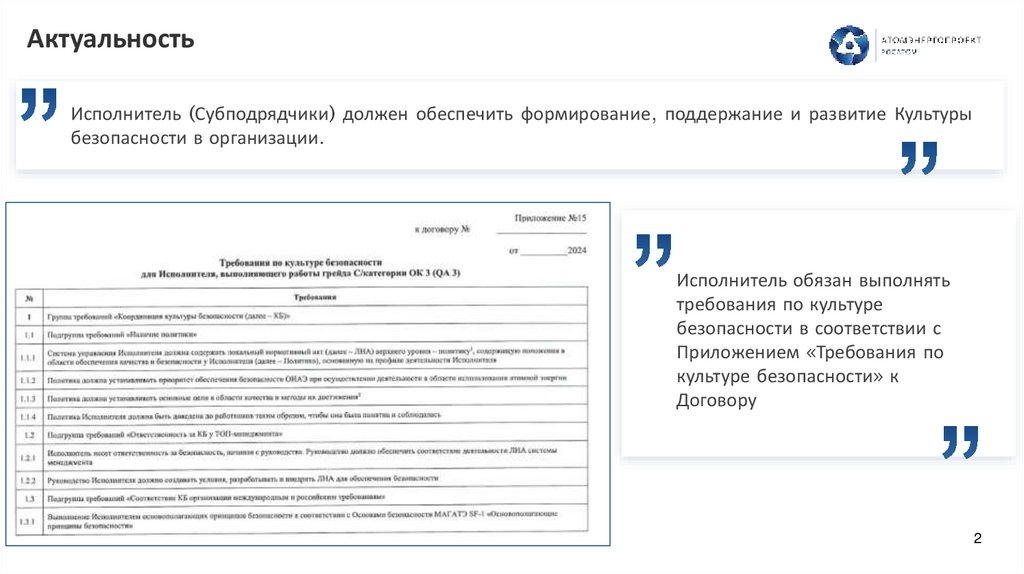 АктуальностьИсполнитель (Субподрядчики) должен обеспечить формирование, поддержание и развитие Культуры