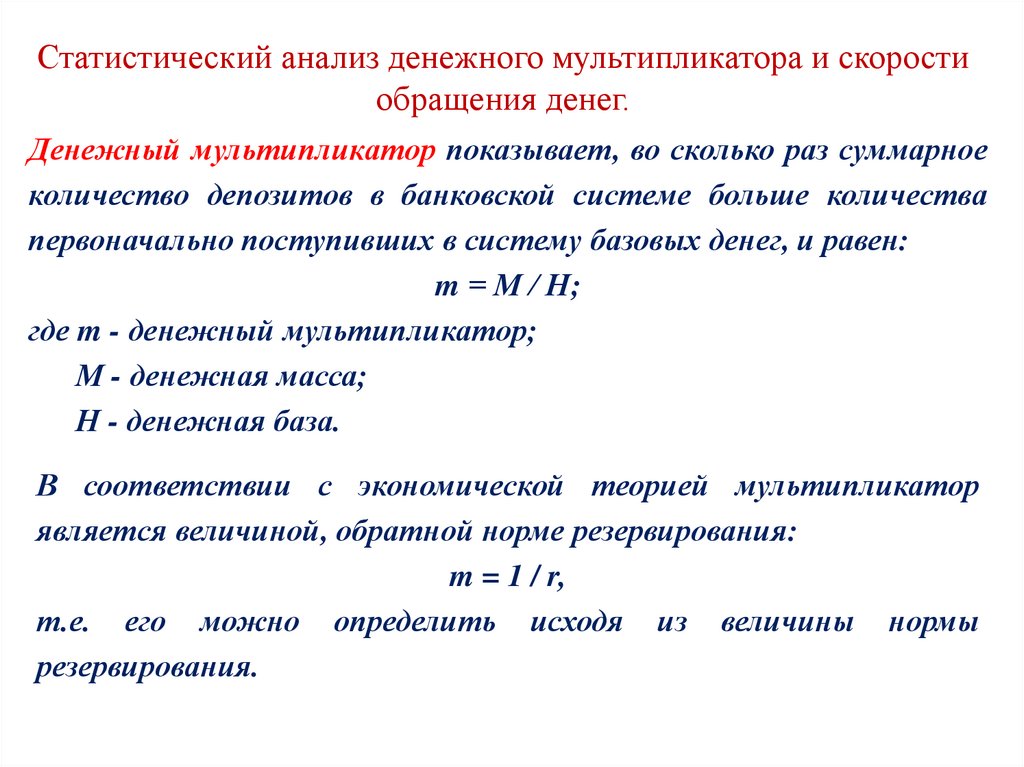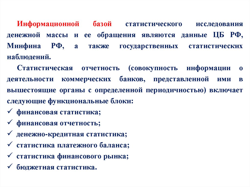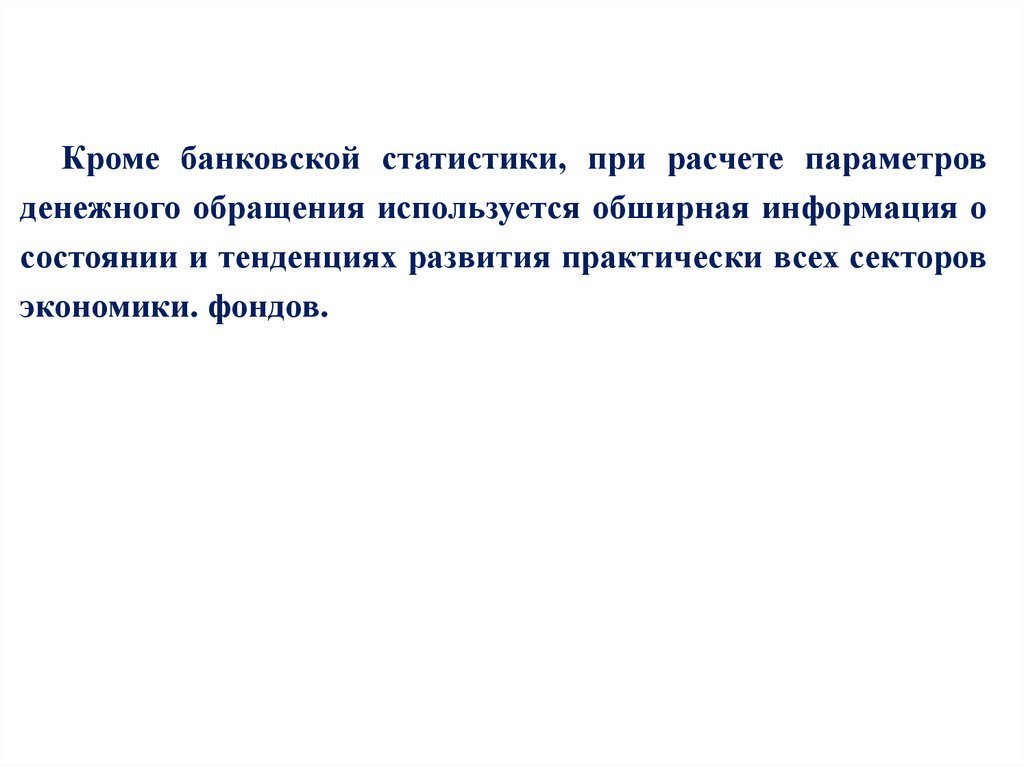Кроме банковской статистики, при расчете параметровденежного обращения используется обширная информация о