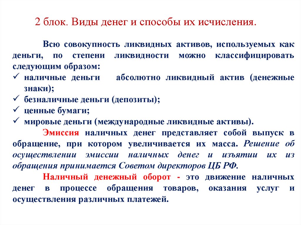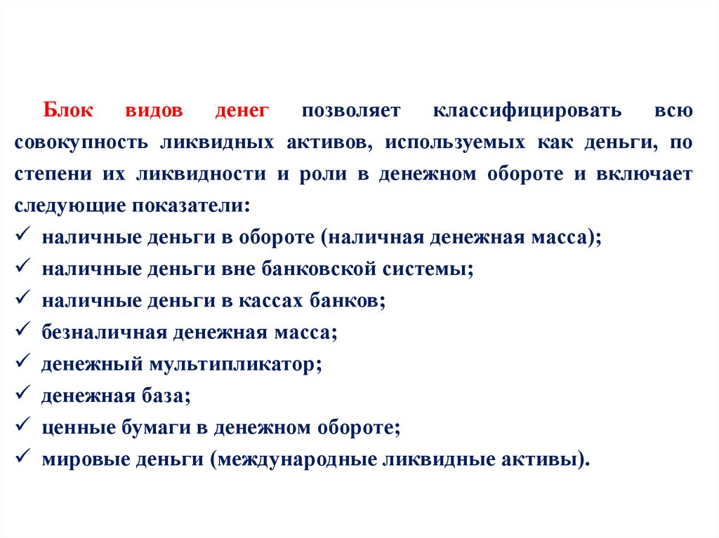 Блок видов денег позволяет классифицировать всюсовокупность ликвидных активов, используемых как деньги, по