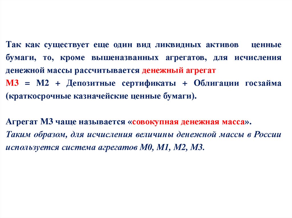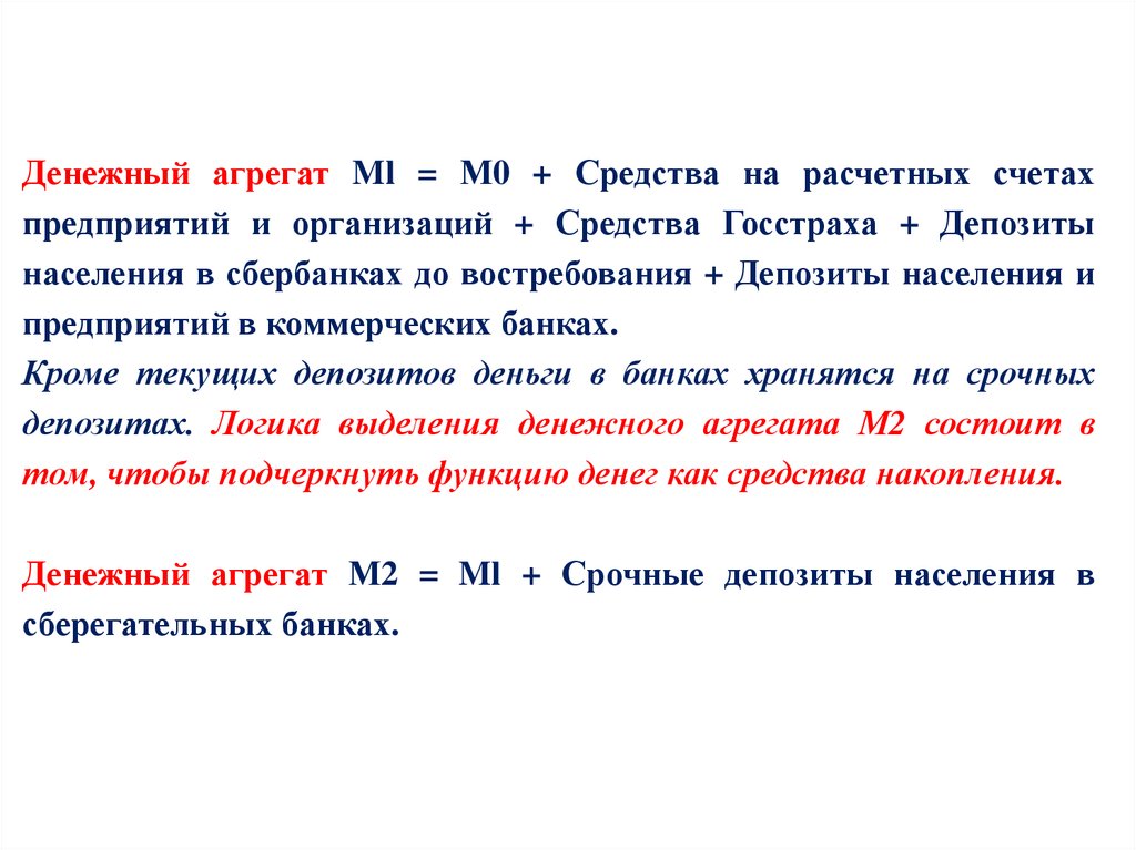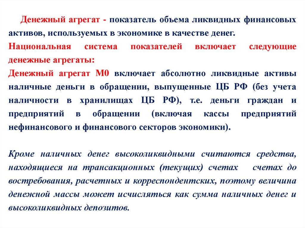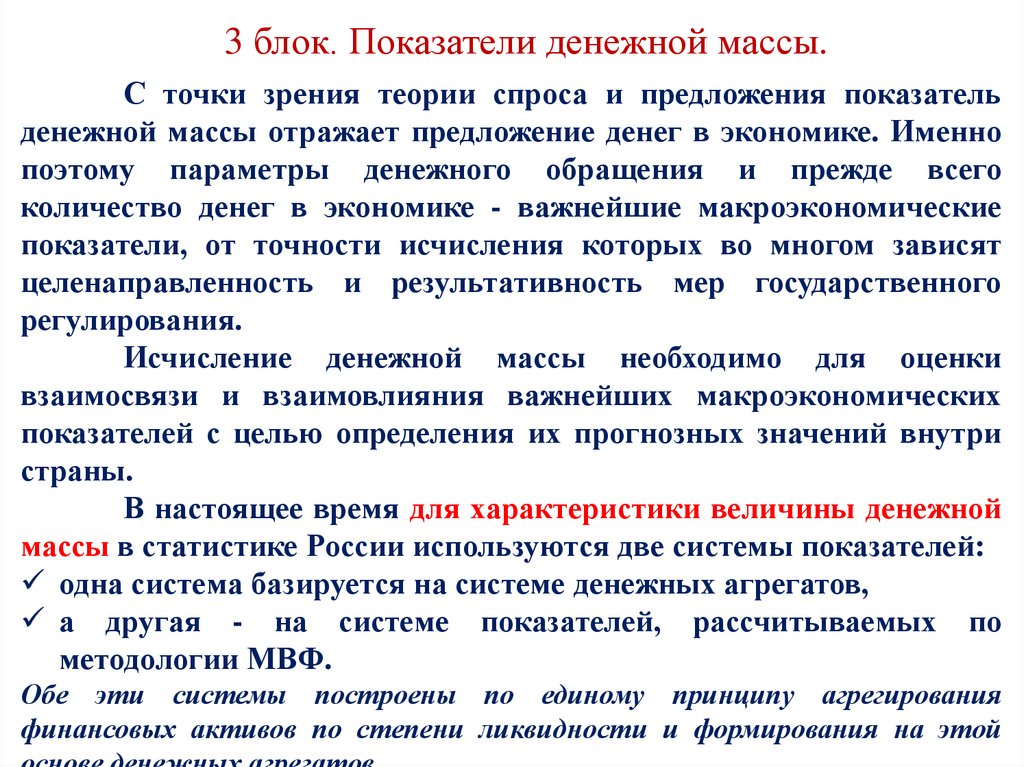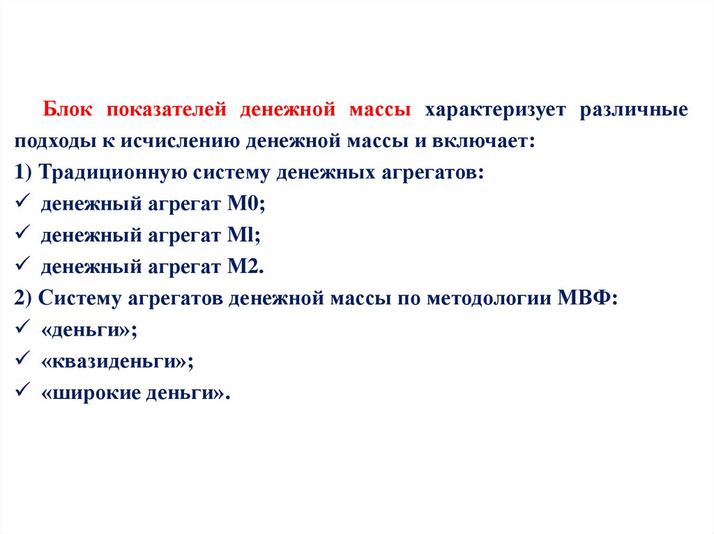 Блок показателей денежной массы характеризует различныеподходы к исчислению денежной массы и включает: