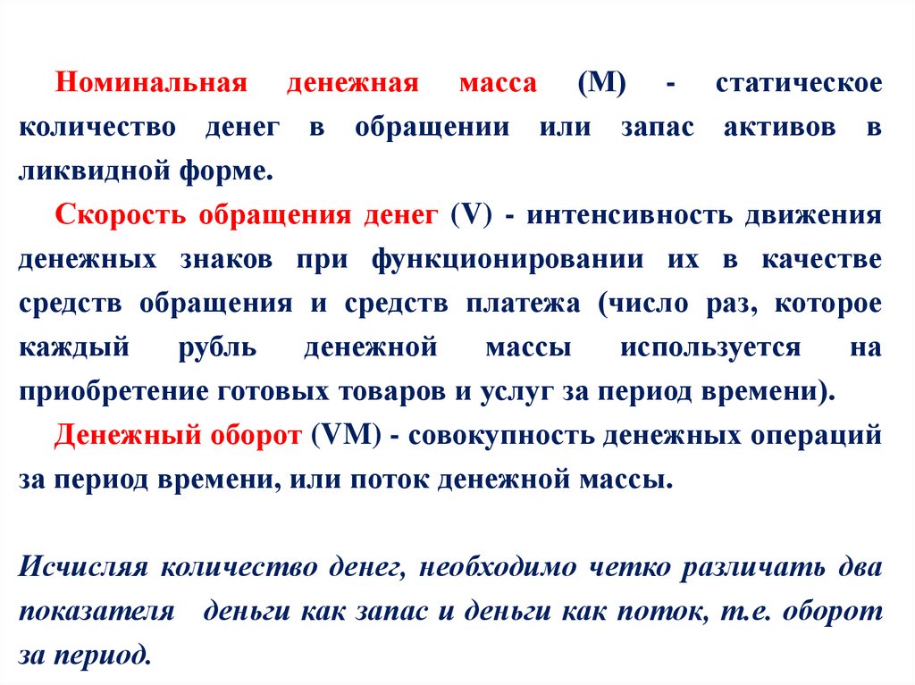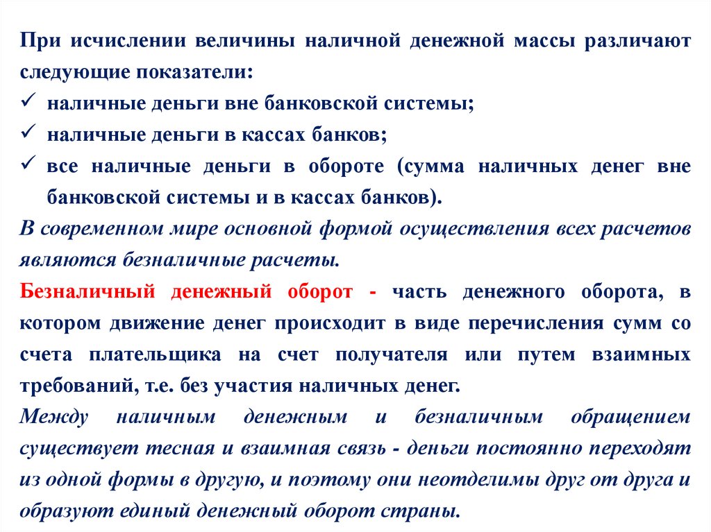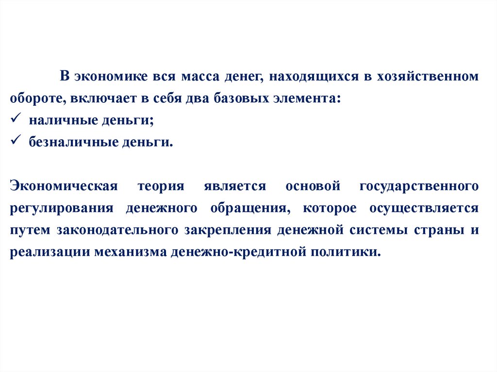 В экономике вся масса денег, находящихся в хозяйственномобороте, включает в себя два базовых элемента: