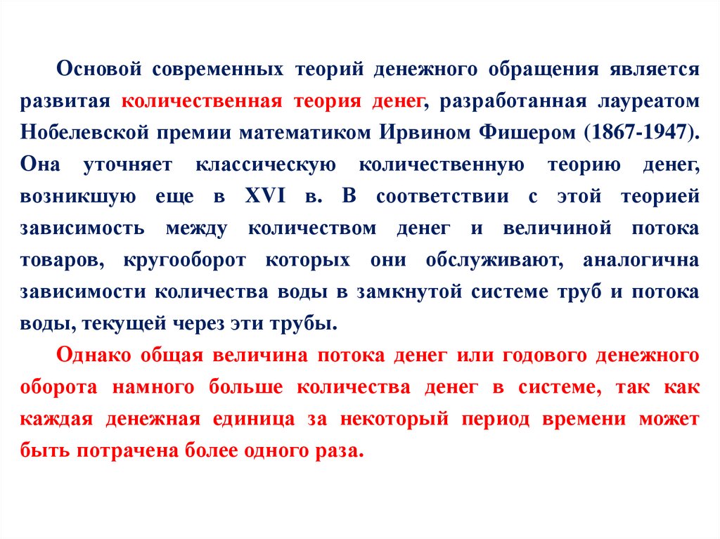 Основой современных теорий денежного обращения являетсяразвитая количественная теория денег, разработанная лауреатом