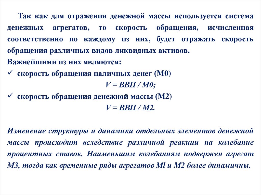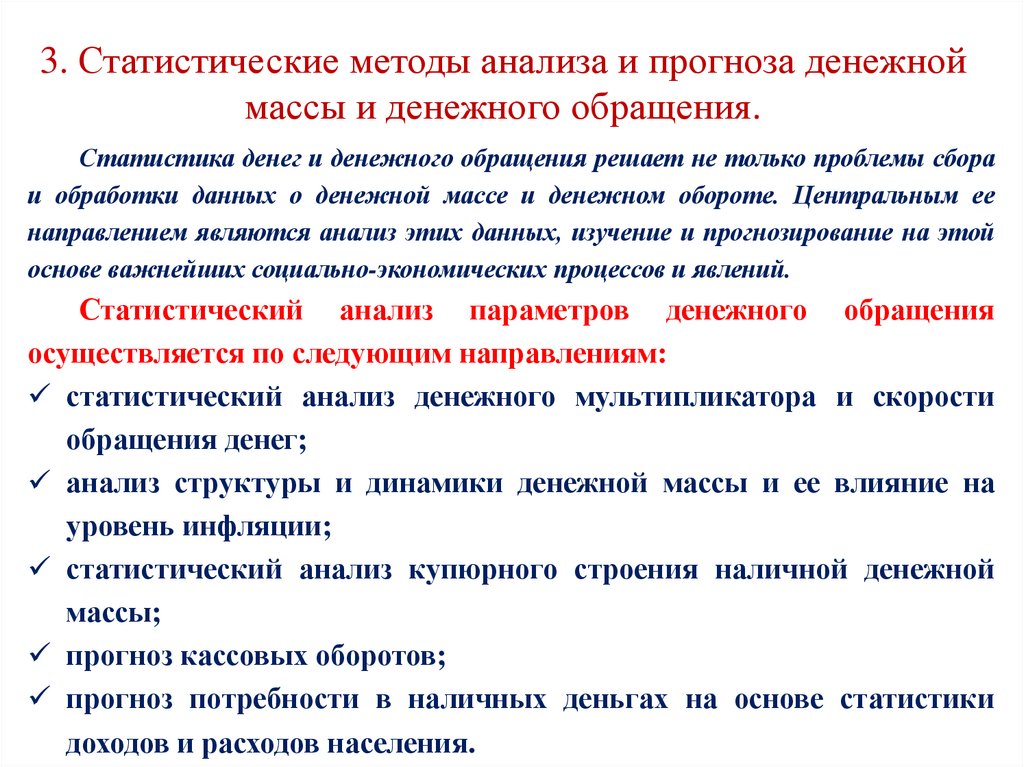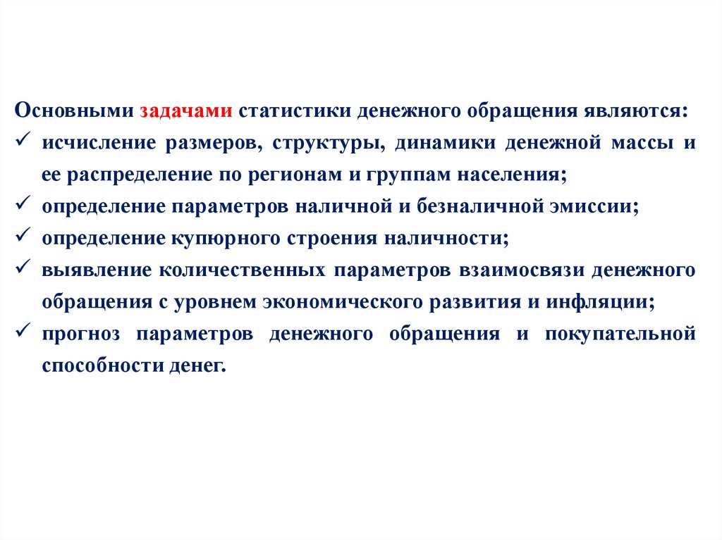Основными задачами статистики денежного обращения являются:исчисление размеров, структуры, динамики денежной массы и