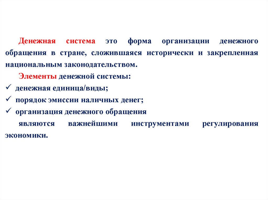 Денежная система это форма организации денежногообращения в стране, сложившаяся исторически и закрепленная