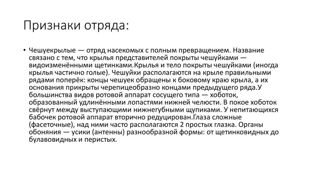 Признаки отряда:• Чешуекрылые — отряд насекомых с полным превращением. Название