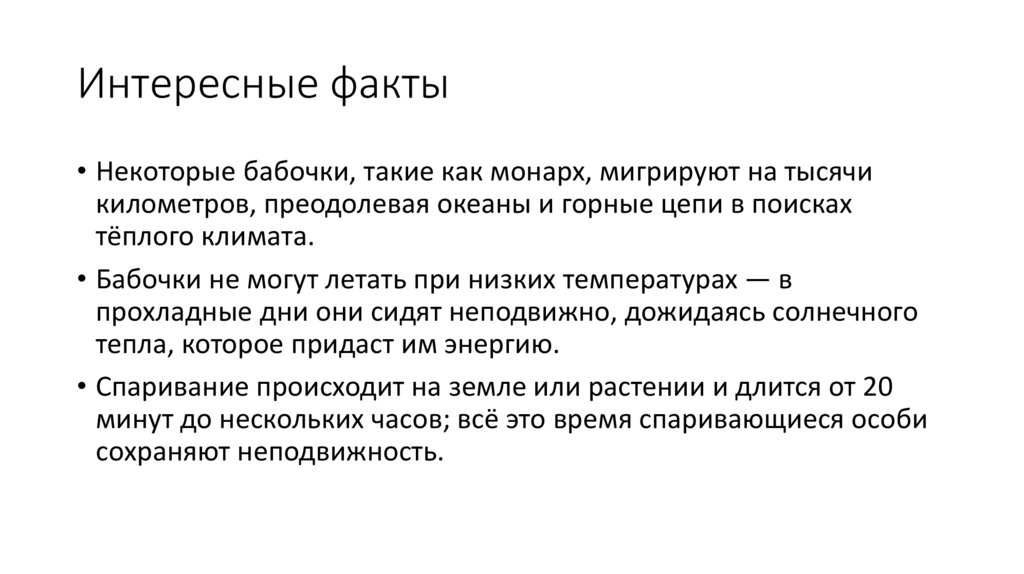 Интересные факты• Некоторые бабочки, такие как монарх, мигрируют на тысячи