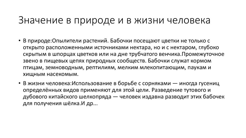 Значение в природе и в жизни человека• В природе:Опылители растений. Бабочки посещают цветки не только с