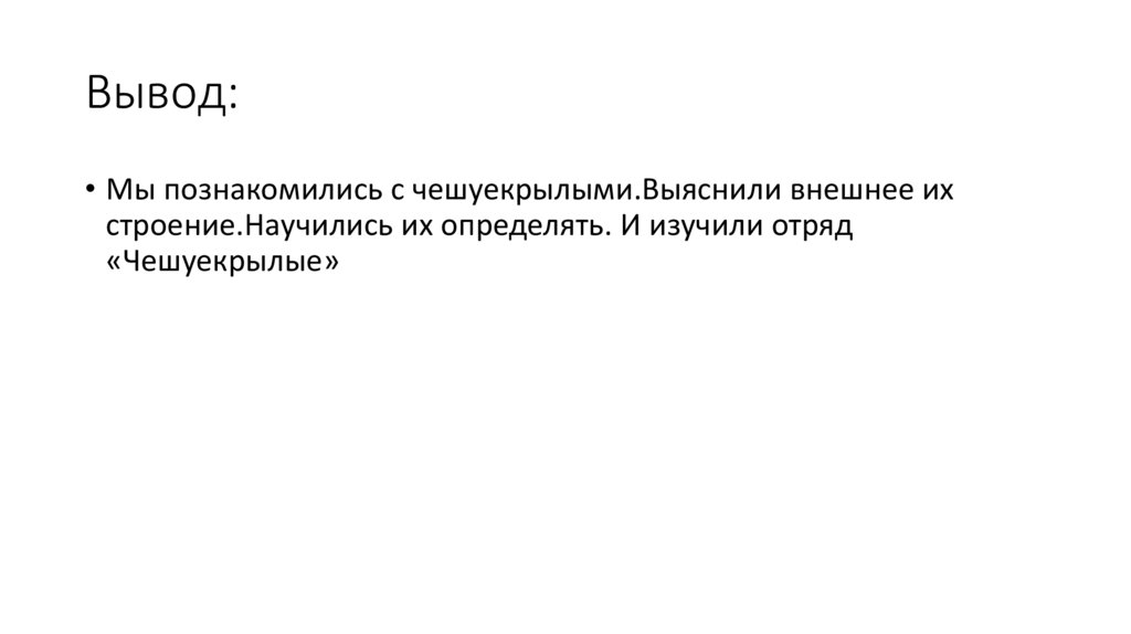 Вывод:• Мы познакомились с чешуекрылыми.Выяснили внешнее их