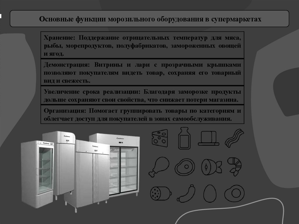 Основные функции морозильного оборудования в супермаркетахХранение: Поддержание отрицательных температур для мяса,