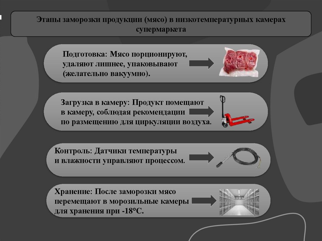 Этапы заморозки продукции (мясо) в низкотемпературных камерахсупермаркета