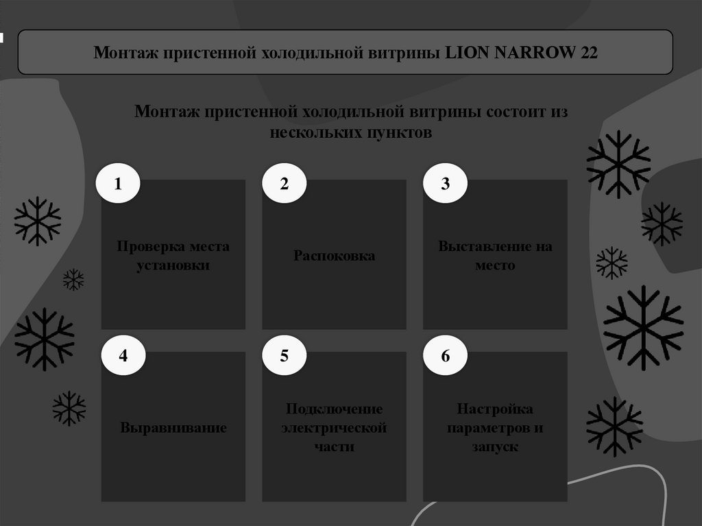 Монтаж пристенной холодильной витрины LION NARROW 22Монтаж пристенной холодильной витрины состоит из
