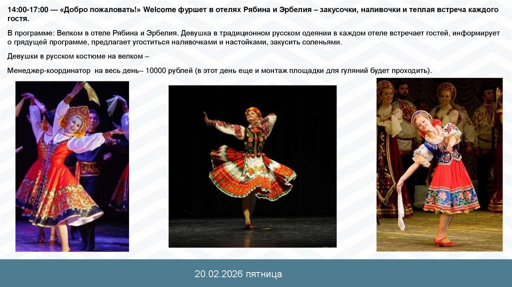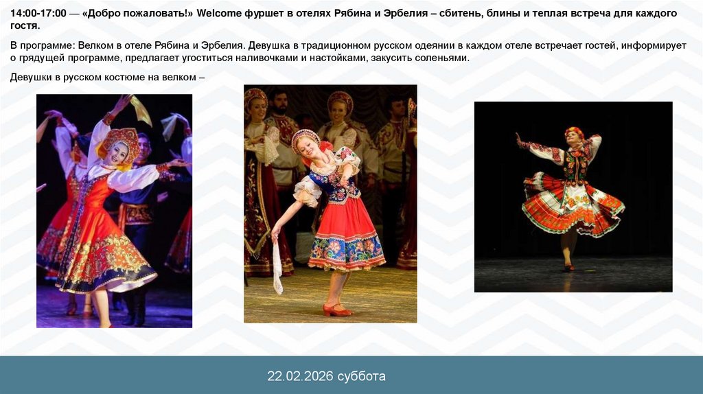 В программе: Велком в отеле Рябина и Эрбелия. Девушка в традиционном русском одеянии в каждом отеле встречает гостей, информирует