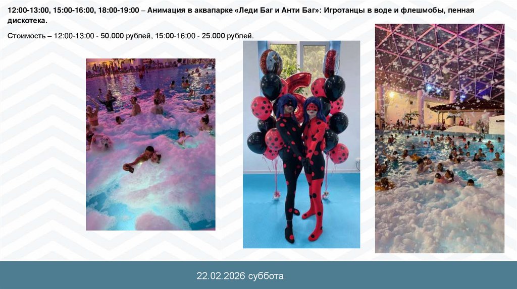 12:00-13:00, 15:00-16:00, 18:00-19:00 – Анимация в аквапарке «Леди Баг и Анти Баг»: Игротанцы в воде и флешмобы, пеннаядискотека.