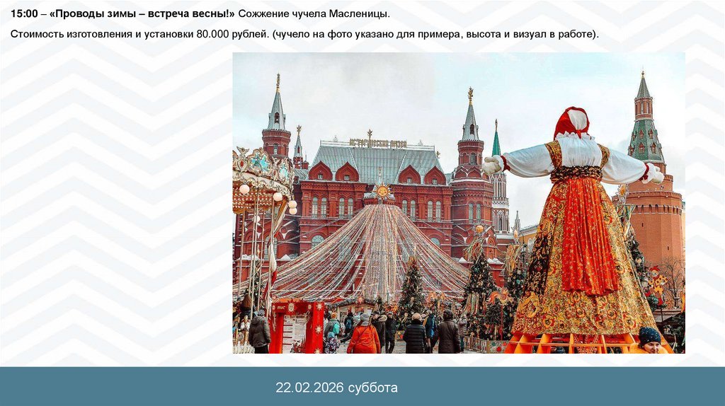 15:00 – «Проводы зимы – встреча весны!» Сожжение чучела Масленицы.Стоимость изготовления и установки 80.000 рублей. (чучело на фото указано для примера, высота и визуал в работе).