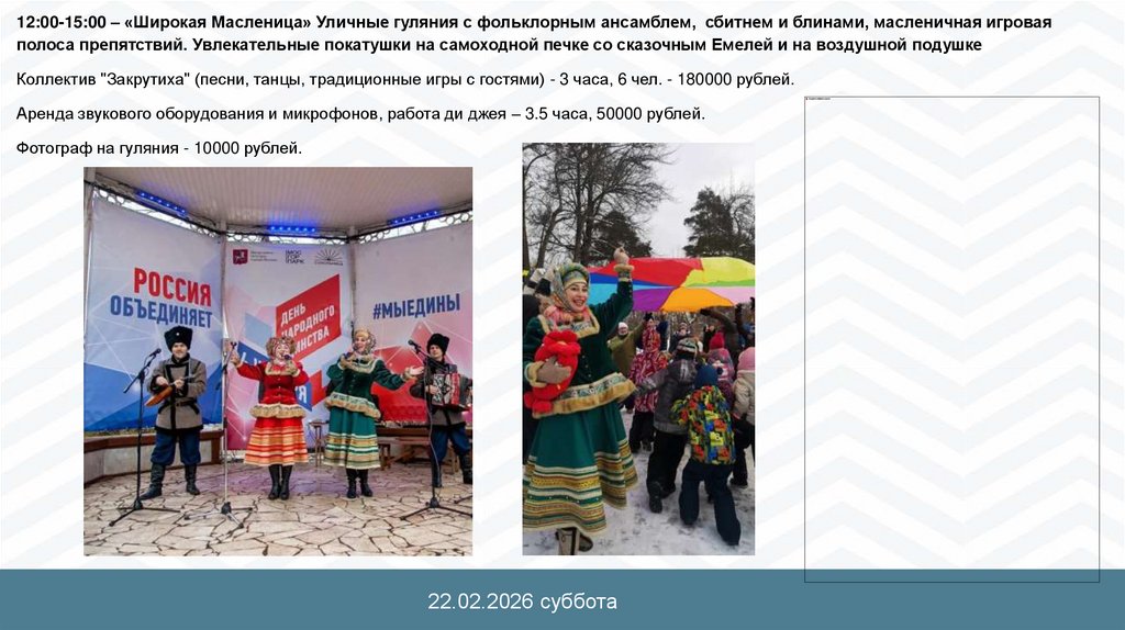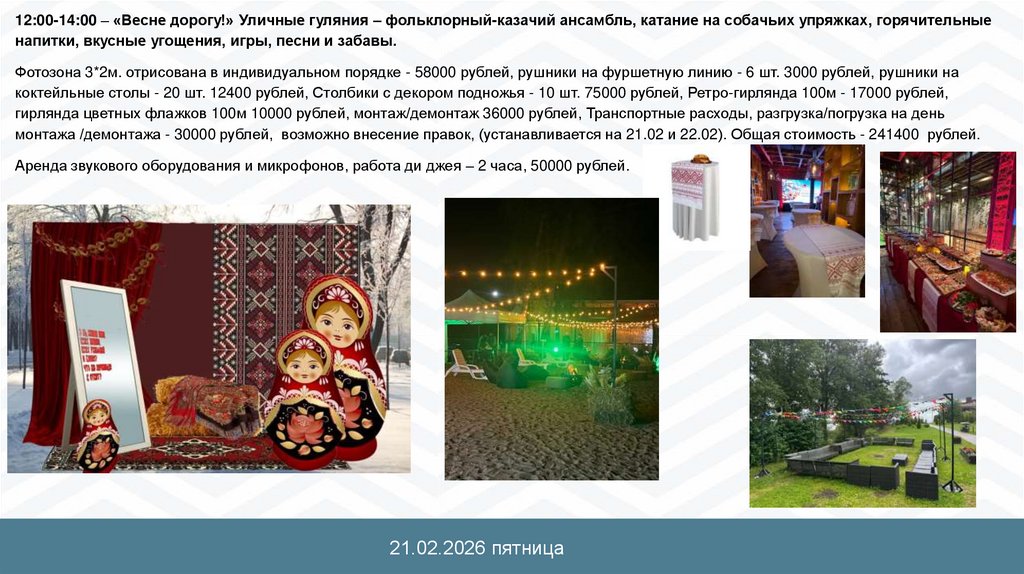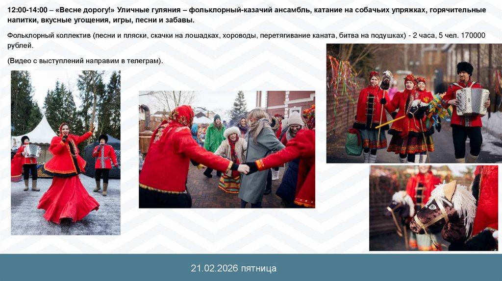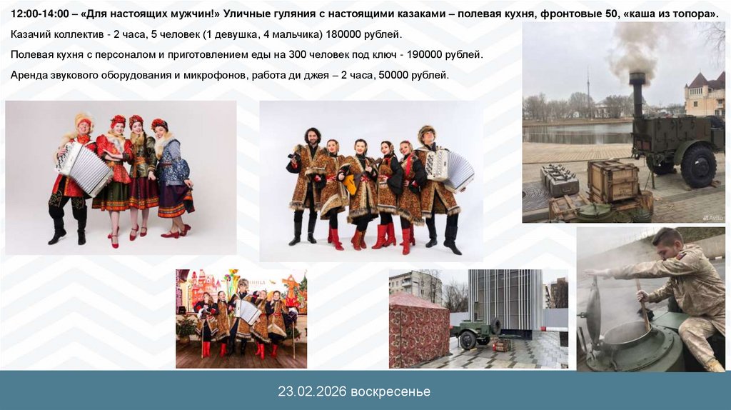 12:00-14:00 – «Для настоящих мужчин!» Уличные гуляния с настоящими казаками – полевая кухня, фронтовые 50, «каша из топора».Казачий коллектив - 2 часа, 5 человек (1 девушка, 4 мальчика) 180000 рублей.