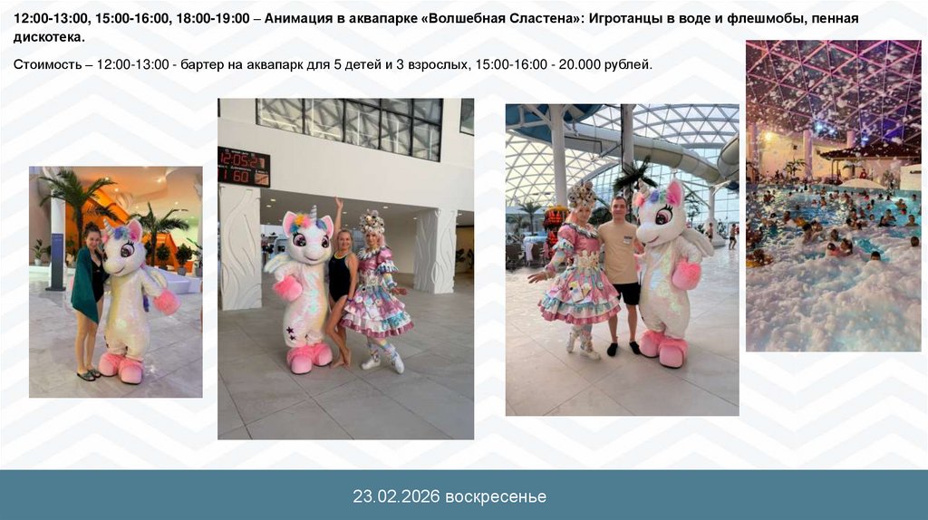 23.02.2026 - 765.000 рублей (без учета велкома 22.02). (Анимация в аквапарке «Волшебная Сластена» бартер на аквапарк для 5 детей