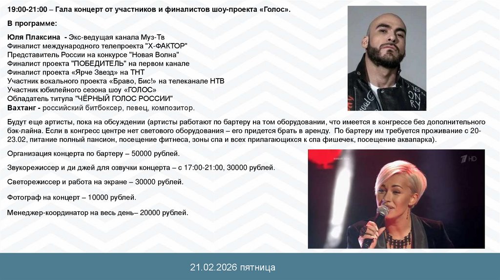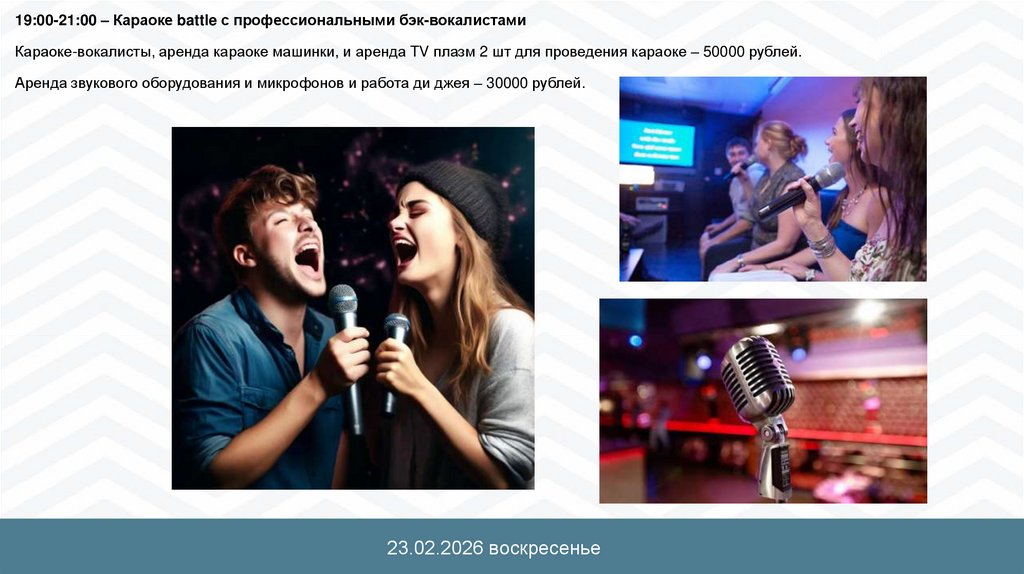 19:00-21:00 – Караоке battle с профессиональными бэк-вокалистамиКараоке-вокалисты, аренда караоке машинки, и аренда TV плазм 2 шт для проведения караоке – 50000 рублей.