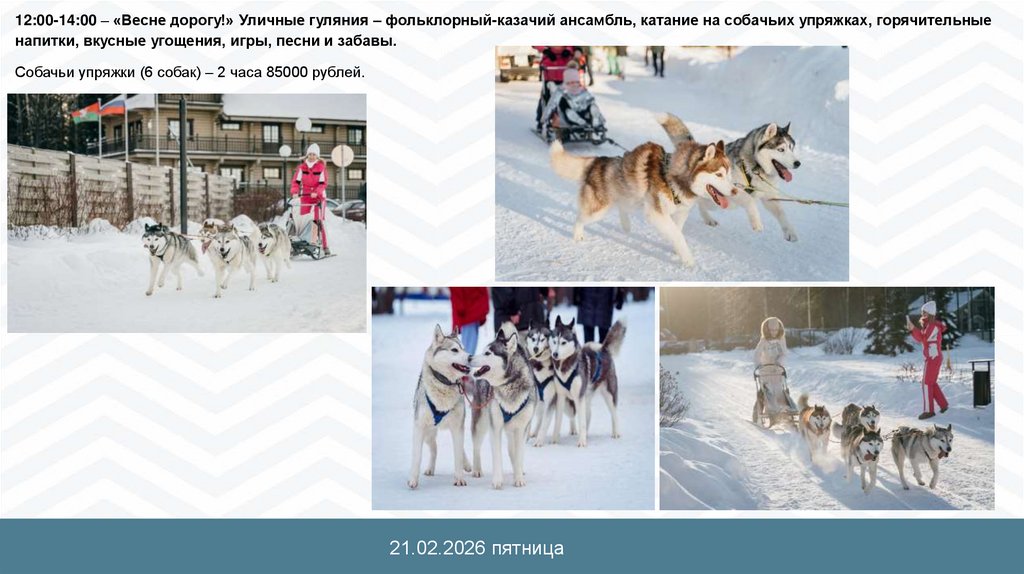 12:00-14:00 – «Весне дорогу!» Уличные гуляния – фольклорный-казачий ансамбль, катание на собачьих упряжках, горячительныенапитки, вкусные угощения, игры, песни и забавы.