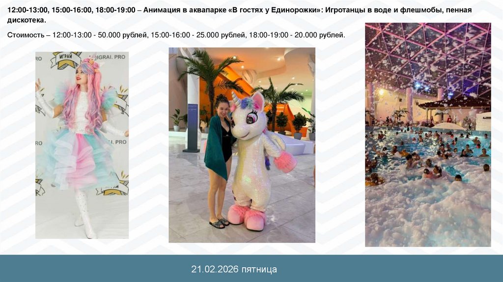 12:00-13:00, 15:00-16:00, 18:00-19:00 – Анимация в аквапарке «В гостях у Единорожки»: Игротанцы в воде и флешмобы, пеннаядискотека.