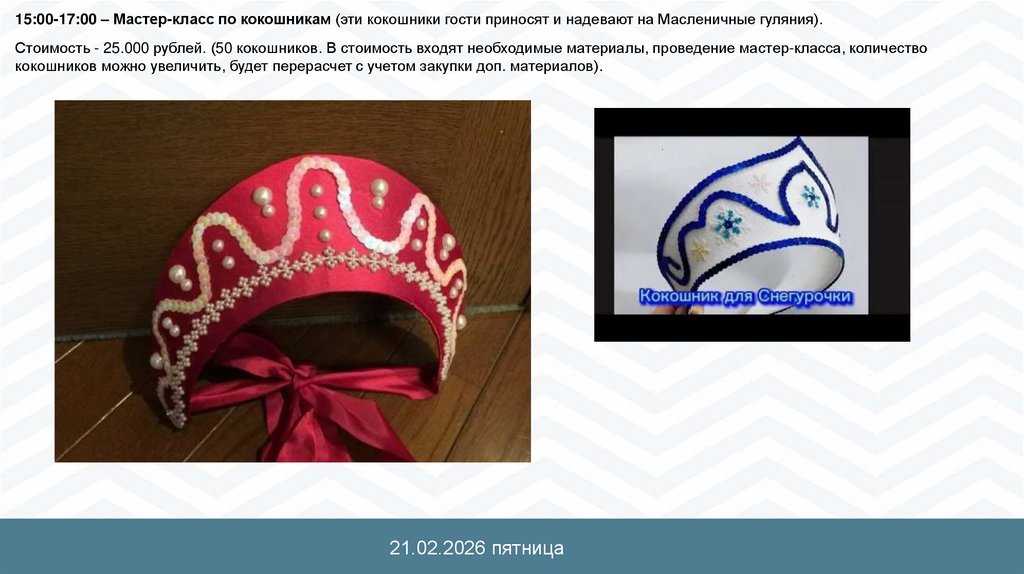 15:00-17:00 – Мастер-класс по кокошникам (эти кокошники гости приносят и надевают на Масленичные гуляния).Стоимость - 25.000 рублей. (50 кокошников. В стоимость входят необходимые материалы, проведение мастер-класса, количество