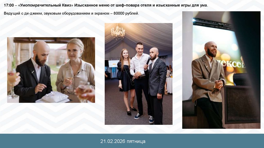 17:00 – «Умопомрачительный Квиз» Изысканное меню от шеф-повара отеля и изысканные игры для ума.Ведущий с ди-джеем, звуковым оборудованием и экраном – 80000 рублей.