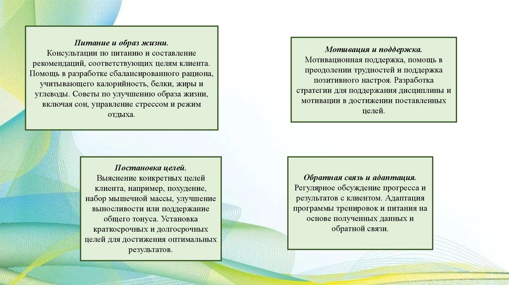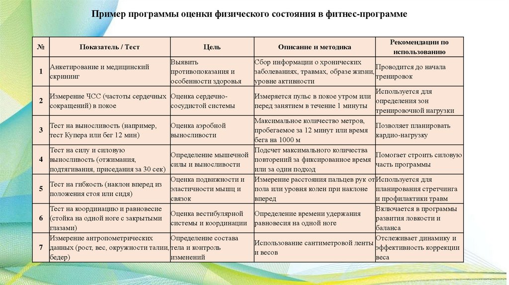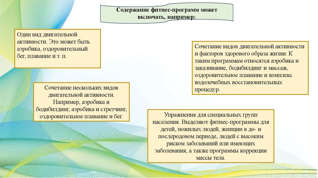 Содержание фитнес-программ можетвключать, например: