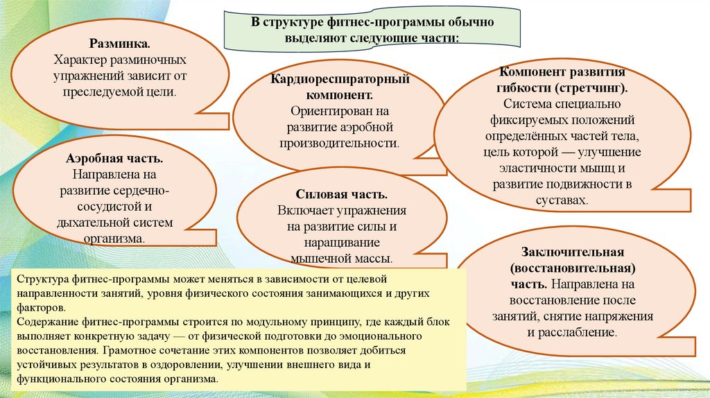 Содержание фитнес-программы строится по модульному принципу, где каждый блок