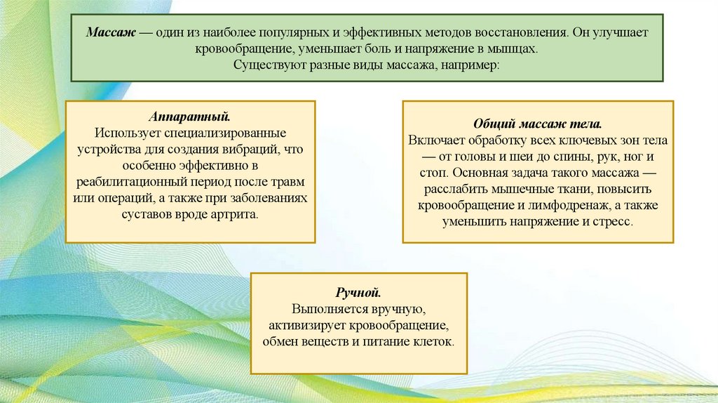 Массаж — один из наиболее популярных и эффективных методов восстановления. Он улучшаеткровообращение, уменьшает боль и напряжение в мышцах.