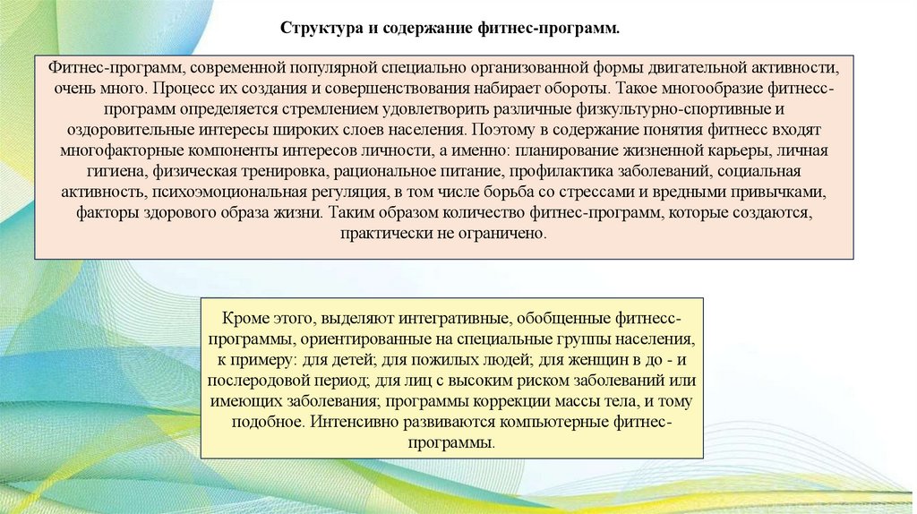 населения. Выделяют фитнес-программы для