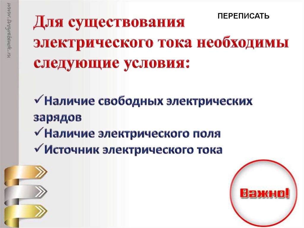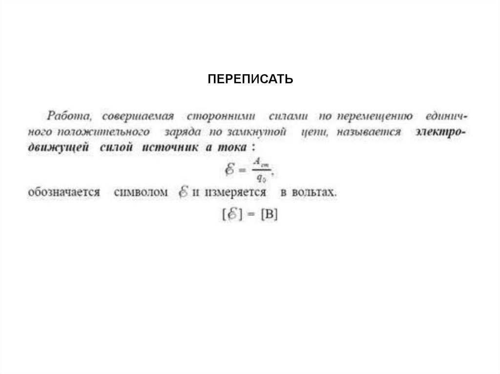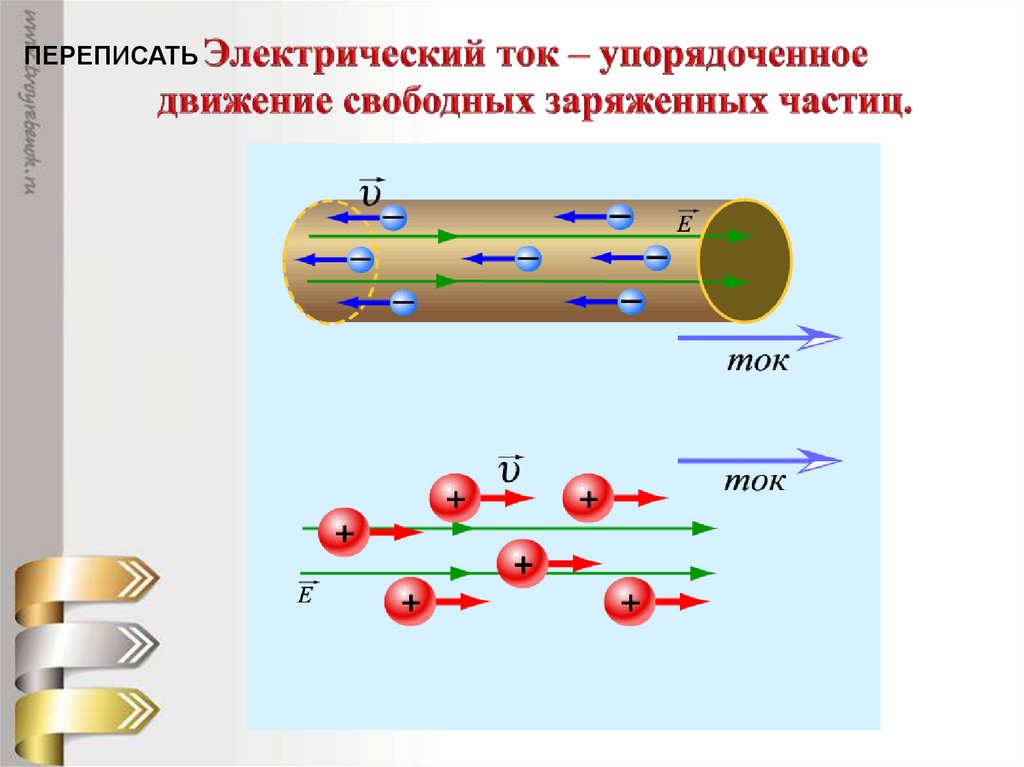 ПЕРЕПИСАТЬ13. ЭЛЕКТРИЧЕСКИЙ ТОК – ЭТО УПОРЯДОЧЕННОЕ НАПРАВЛЕННОЕ ДВИЖЕНИЕ ЗАРЯЖЕННЫХ ЧАСТИЦ