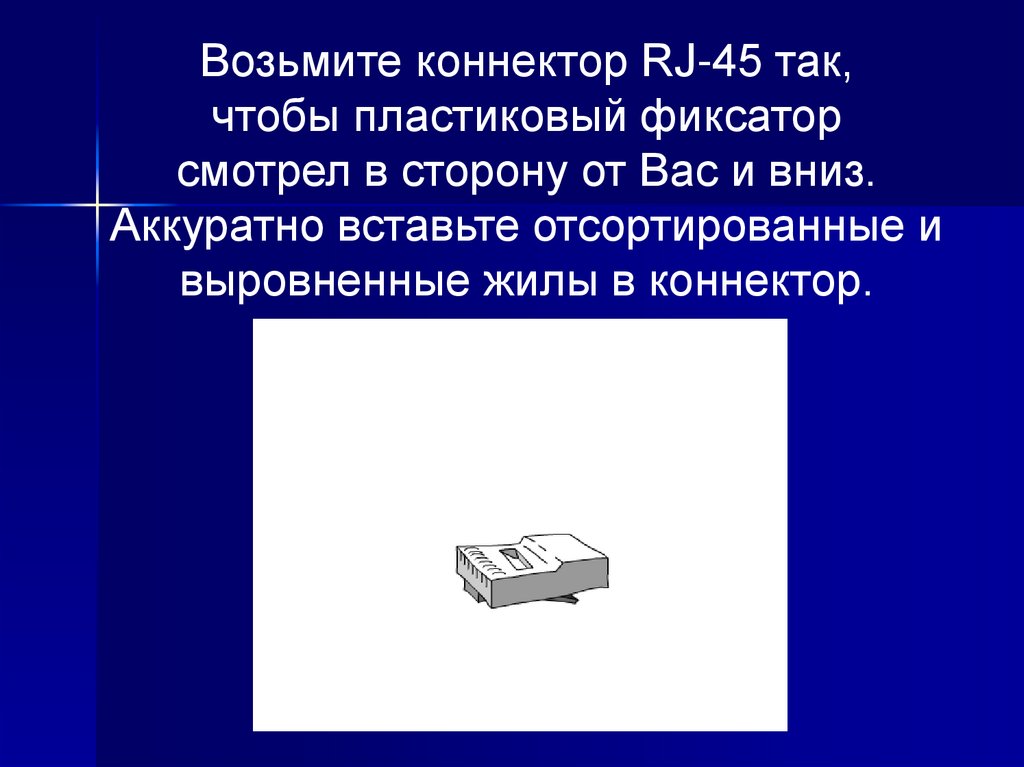 Возьмите коннектор RJ-45 так,чтобы пластиковый фиксатор