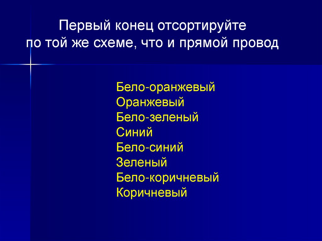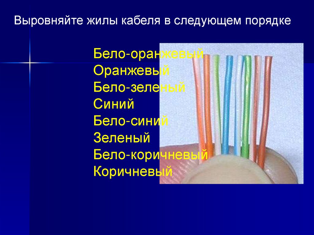 Выровняйте жилы кабеля в следующем порядкеБело-оранжевый