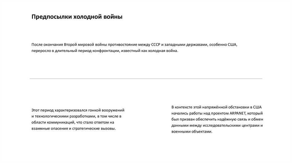 Предпосылки холодной войныПосле окончания Второй мировой войны противостояние между СССР и западными державами, особенно США,
