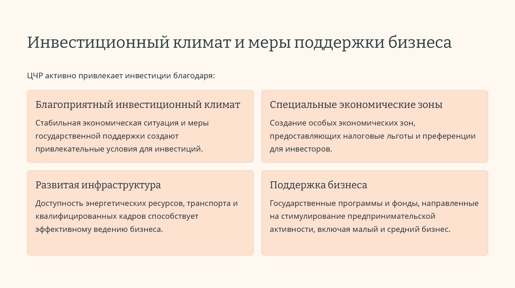 Инвестиционный климат и меры поддержки бизнесаЦЧР активно привлекает инвестиции благодаря: