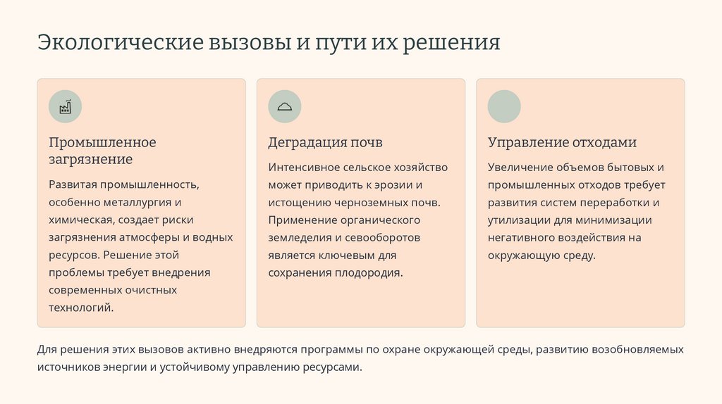 Для решения этих вызовов активно внедряются программы по охране окружающей среды, развитию возобновляемых