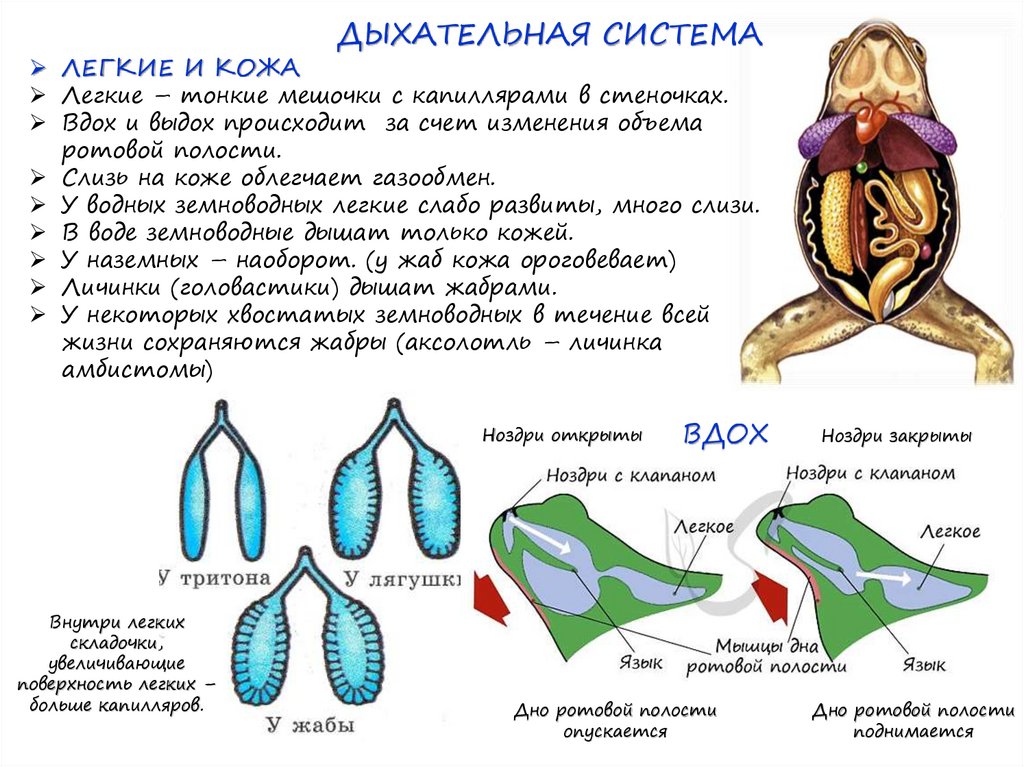 1) органы дыхания представлены лёгкими и кожей