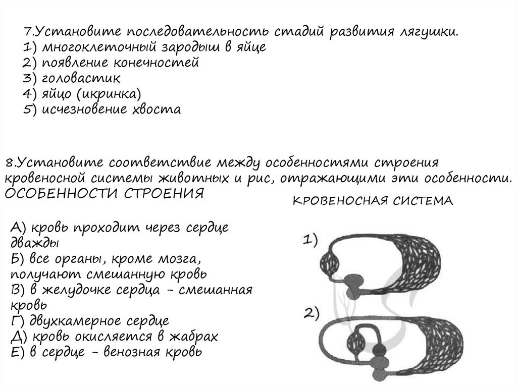 7.Установите последовательность стадий развития лягушки.1) многоклеточный зародыш в яйце
