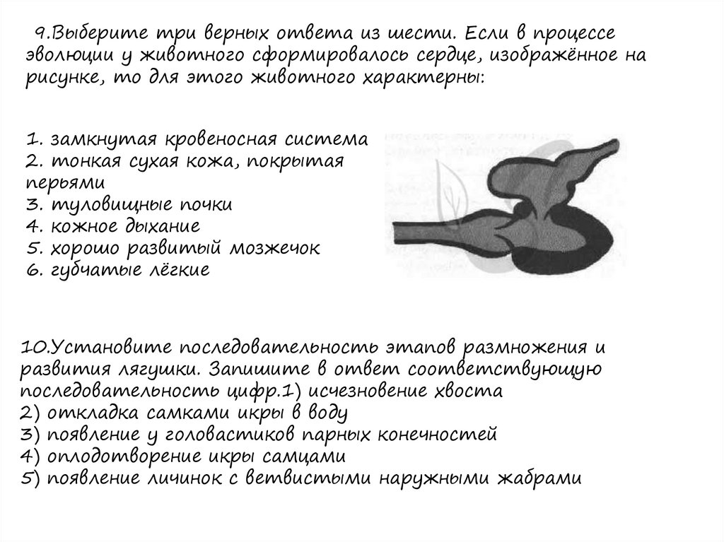 9.Выберите три верных ответа из шести. Если в процессеэволюции у животного сформировалось сердце, изображённое на