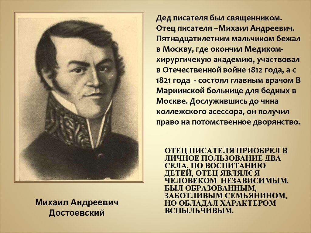 Дед писателя был священником.Отец писателя –Михаил Андреевич.