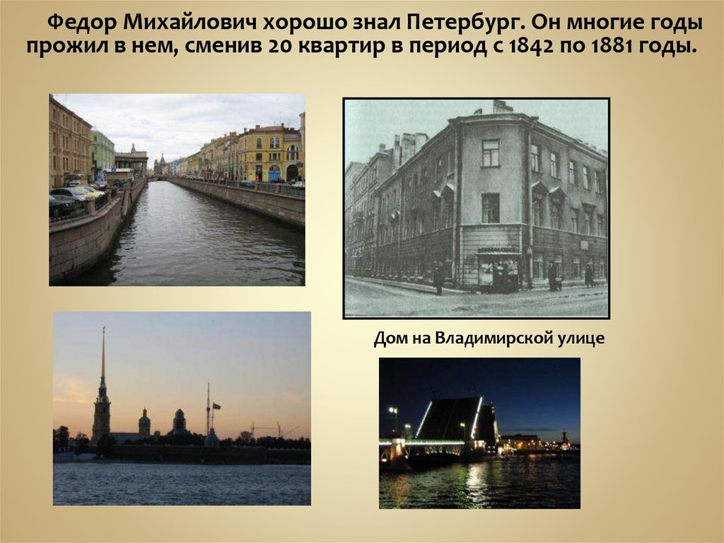 Федор Михайлович хорошо знал Петербург. Он многие годыпрожил в нем, сменив 20 квартир в период с 1842 по 1881 годы.