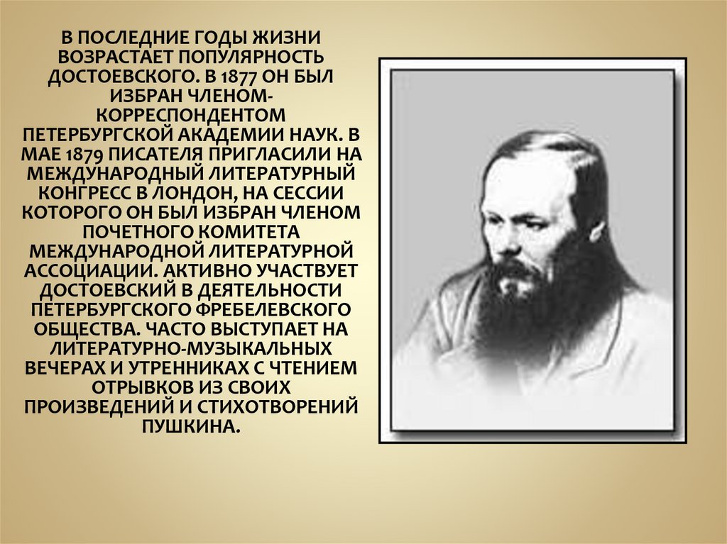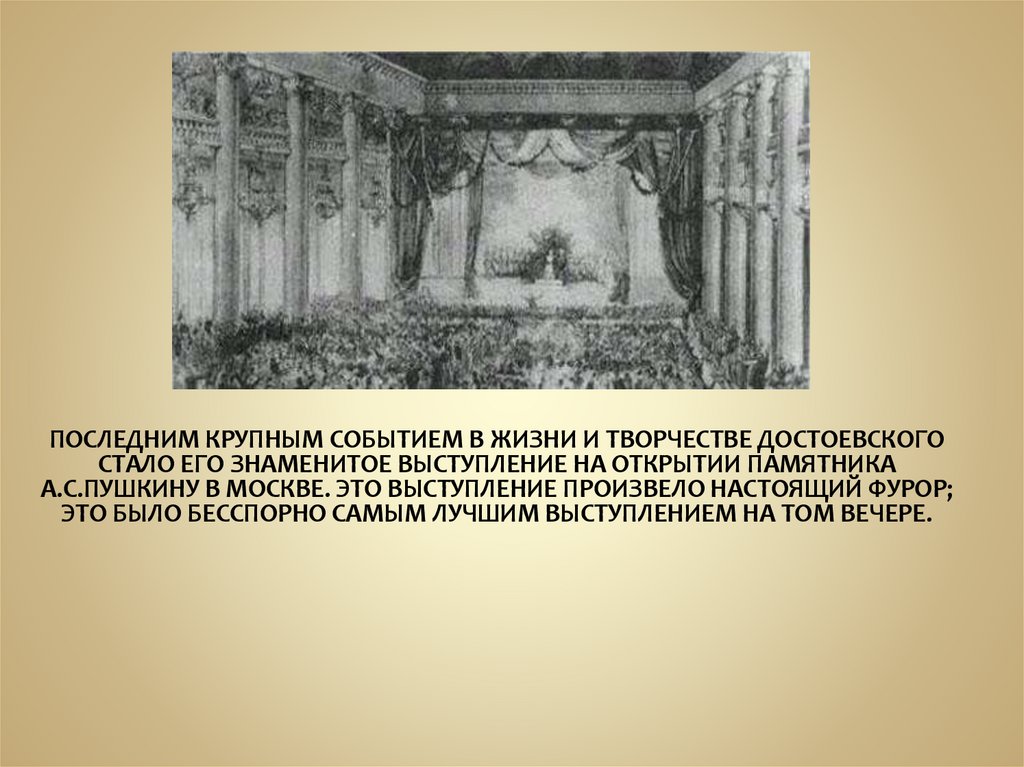ПОСЛЕДНИМ КРУПНЫМ СОБЫТИЕМ В ЖИЗНИ И ТВОРЧЕСТВЕ ДОСТОЕВСКОГОСТАЛО ЕГО ЗНАМЕНИТОЕ ВЫСТУПЛЕНИЕ НА ОТКРЫТИИ ПАМЯТНИКА