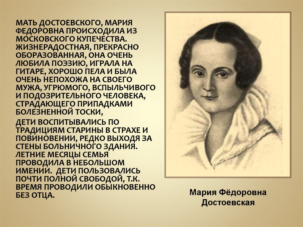 МАТЬ ДОСТОЕВСКОГО, МАРИЯФЕДОРОВНА ПРОИСХОДИЛА ИЗ