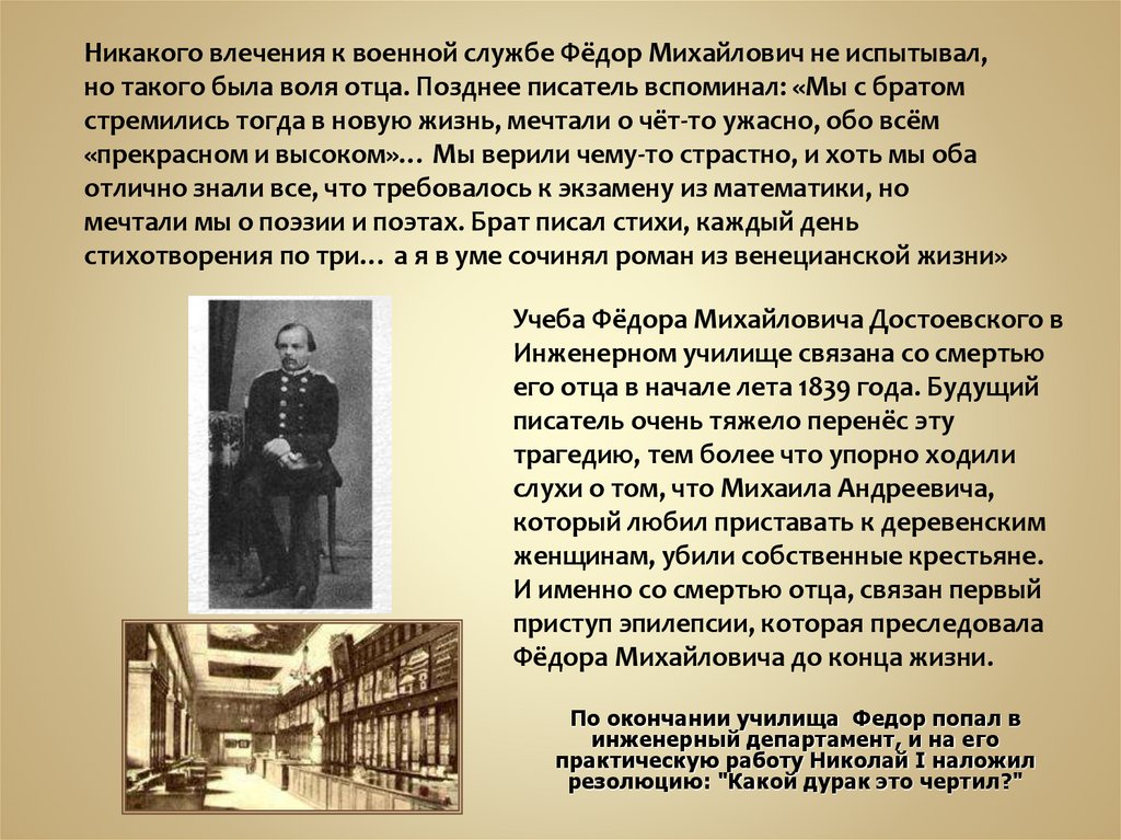 Никакого влечения к военной службе Фёдор Михайлович не испытывал,но такого была воля отца. Позднее писатель вспоминал: «Мы с братом