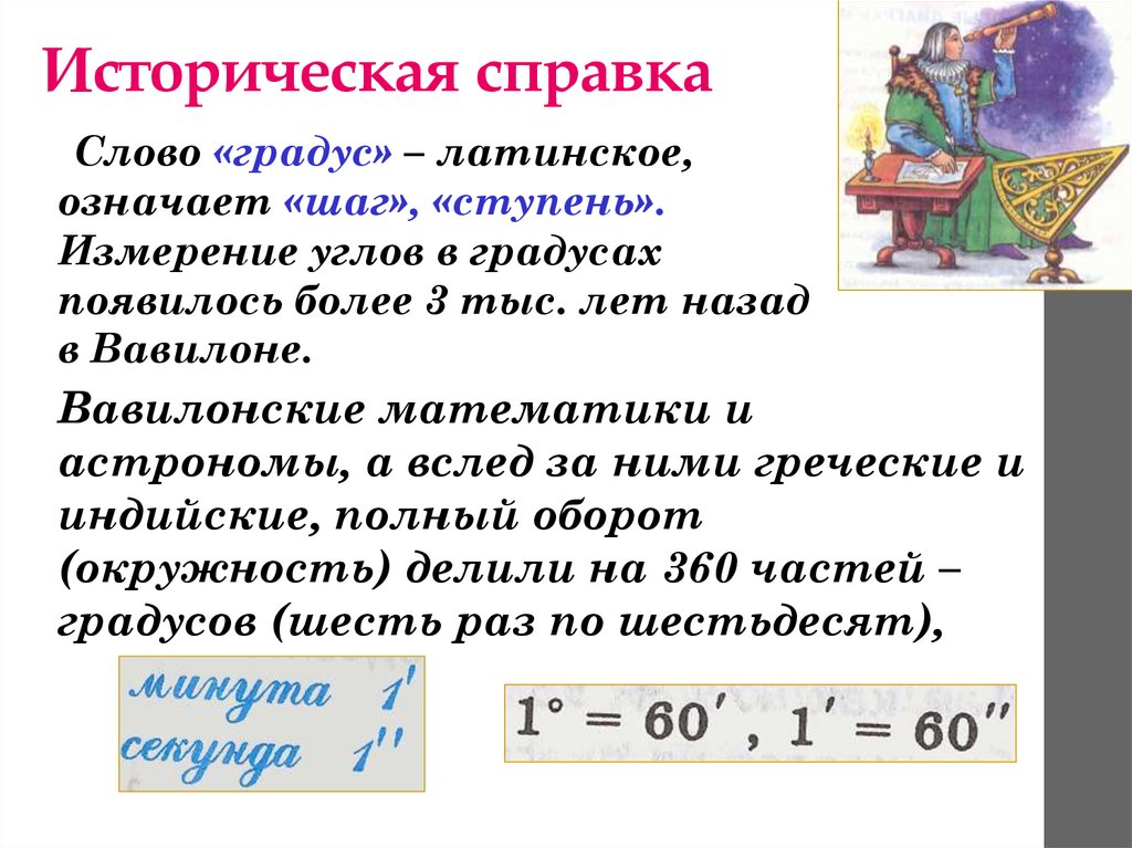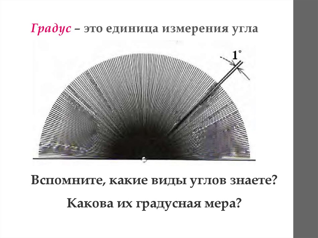 Градус – это единица измерения углаВспомните, какие виды углов знаете?