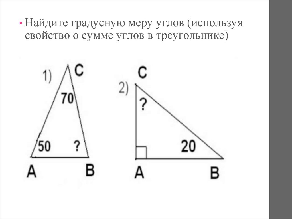 • Найдите градусную меру углов (используясвойство о сумме углов в треугольнике)