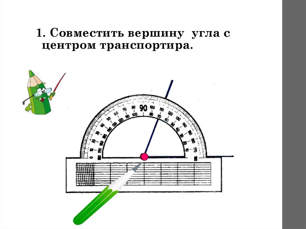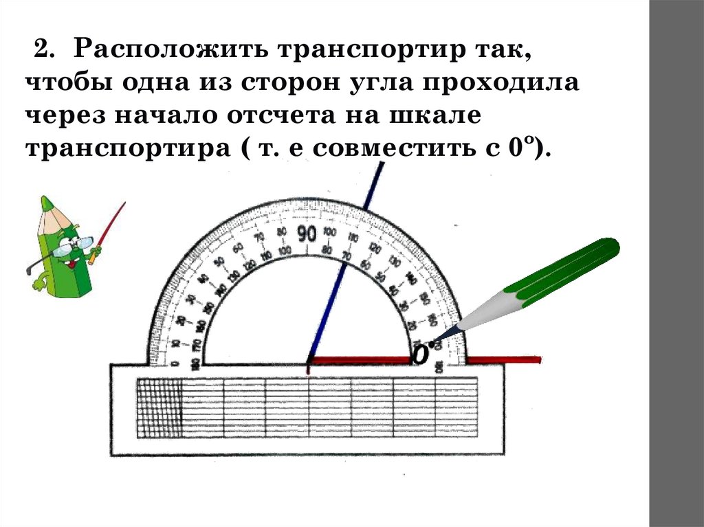 2. Расположить транспортир так,чтобы одна из сторон угла проходила