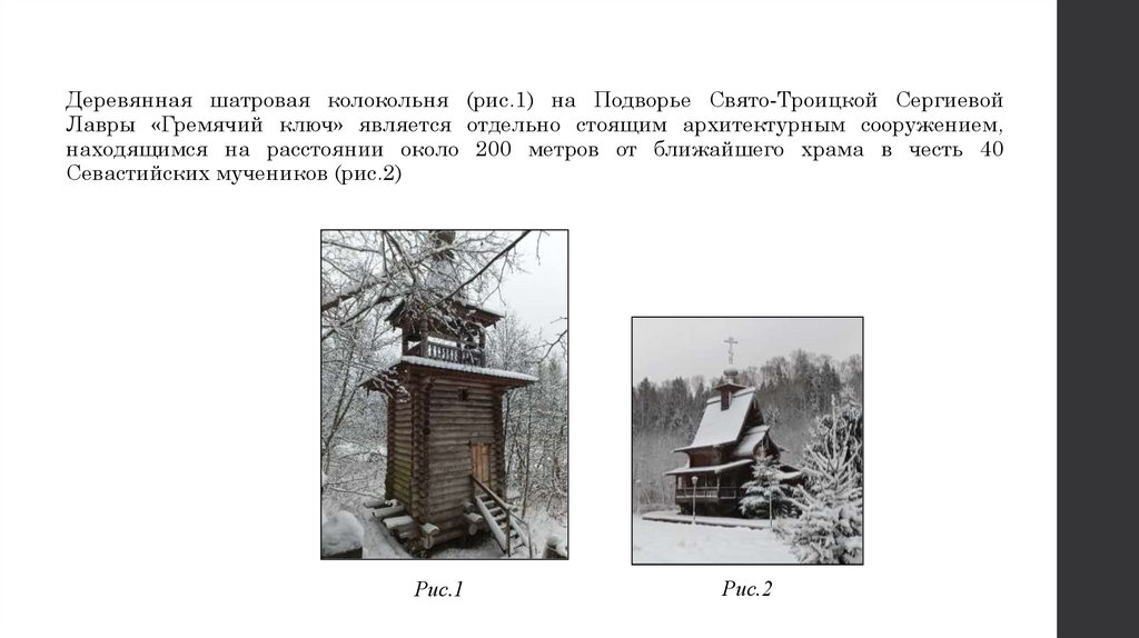 Деревянная шатровая колокольня (рис.1) на Подворье Свято-Троицкой СергиевойЛавры «Гремячий ключ» является отдельно стоящим архитектурным сооружением,