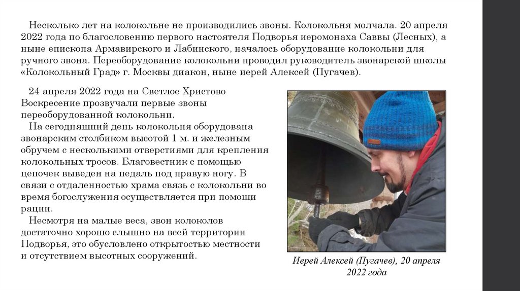 Несколько лет на колокольне не производились звоны. Колокольня молчала. 20 апреля2022 года по благословению первого настоятеля Подворья иеромонаха Саввы (Лесных), а